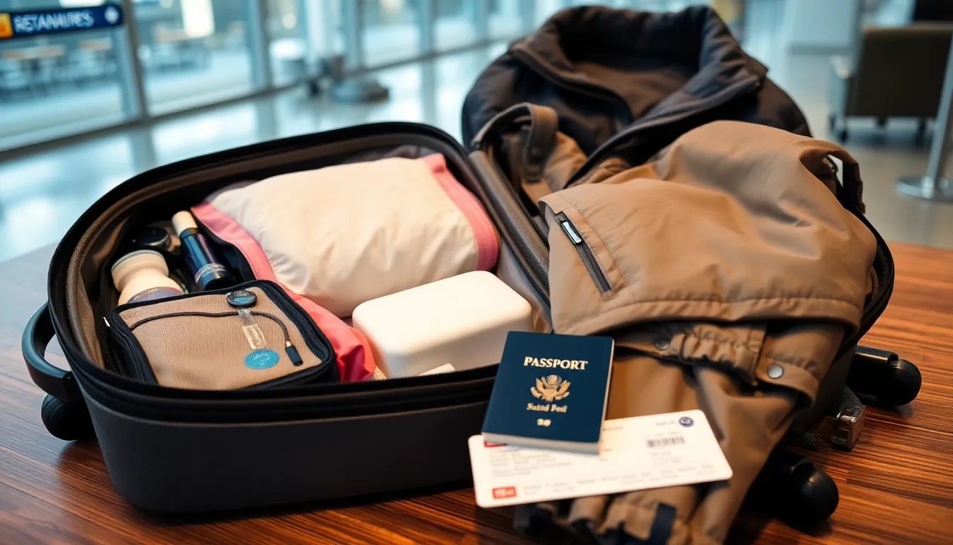 Use packing cubes to streamline luggage organization. Roll clothes instead of folding to save space. Keep essentials like toiletries and chargers in easy-to-access areas. Consider packing a separate small bag for the items needed during the flight. Include a lightweight jacket in case of temperature changes at the airport. Don’t forget to bring snacks to avoid expensive airport options. Lastly, avoid overpacking by creating a packing list to ensure only necessary items are included.